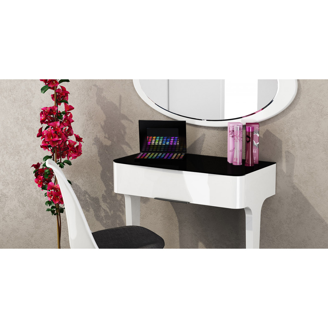 Пристенный туалетный столик в спальню МН-024-07 серии Верона от Мебель-Неман представляет собой легкую консольную конструкцию, с изящными ножками, выдвижным ящиком и черной глянцевой столешницей. Купить белый приставной столик можно в качестве изящного туалетного столика или полки.