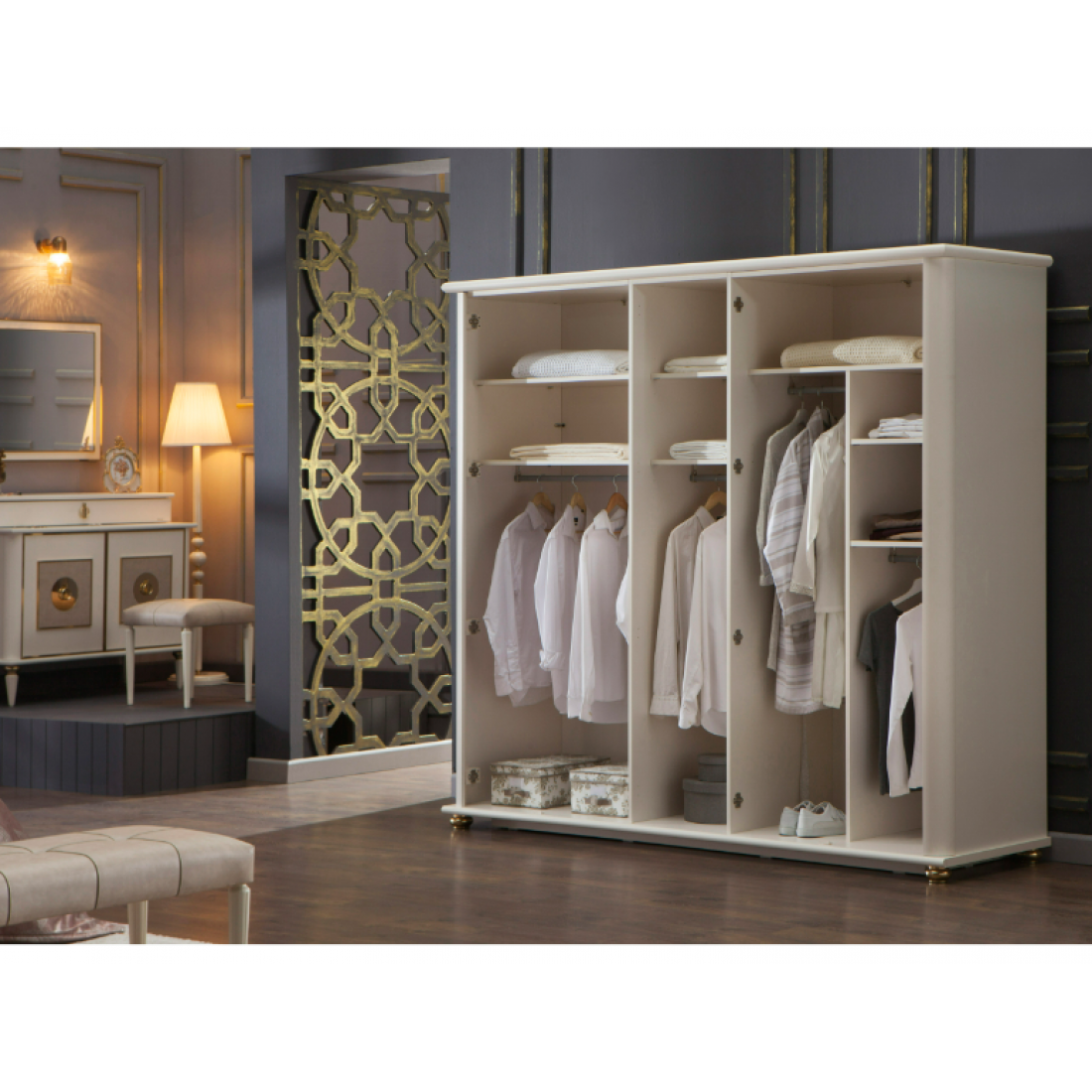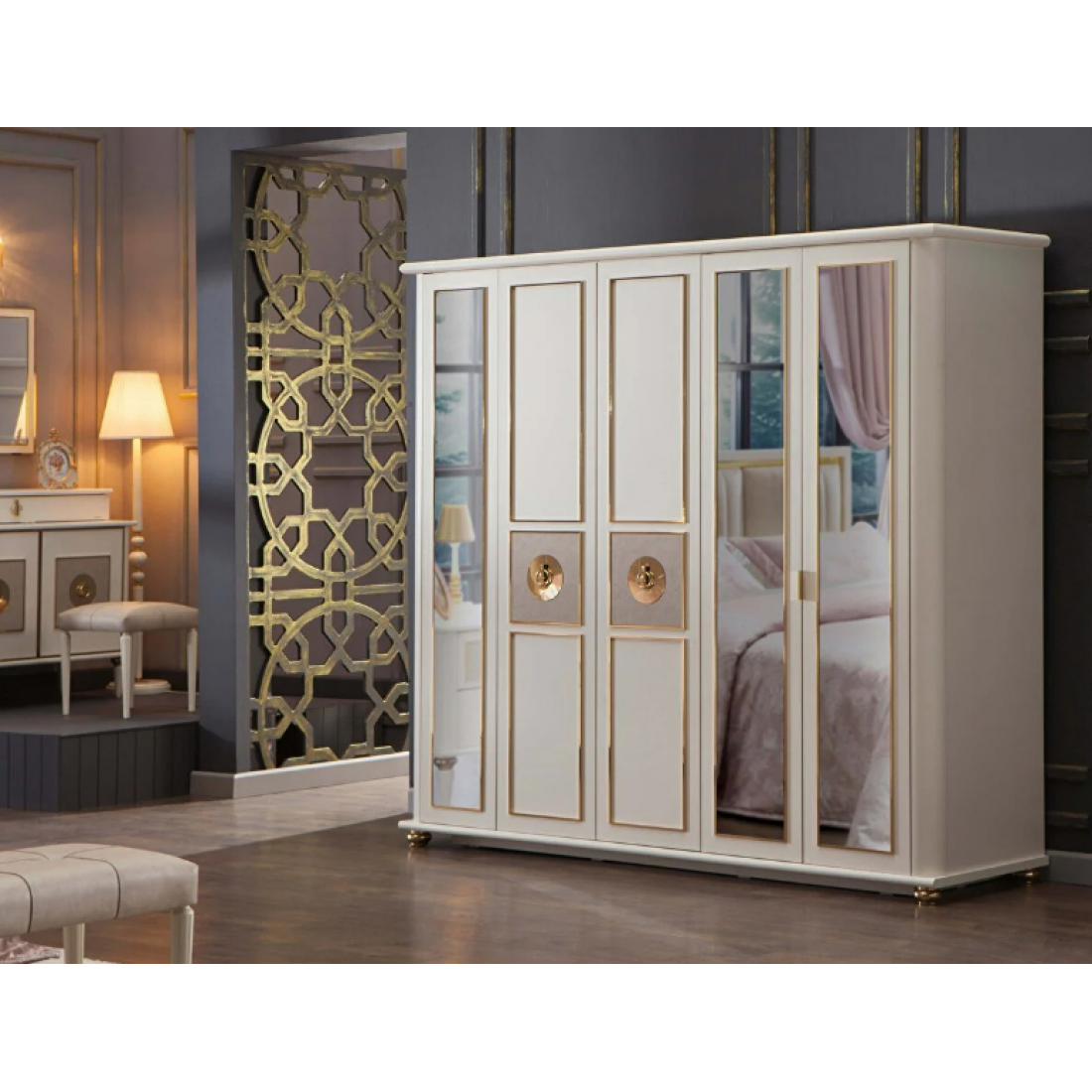 Пятидверный платяной шкаф Mistral от Bellona. Три зеркальные двери по краям, и две двери с золотой отделкой, металлическими ручками в виде петли в центре. Шкаф вместительный, по высоте подходит для большинства помещений, глубина 68 см - позволит удобно разместить вешалки с одеждой. Наполнение шкафа – два широких отделения с вешалками и полками, одно узкое отделение с 2 полками и штангой. Двери с доводчиками, обеспечивающими плавный ход и безопасность. Шкаф изготовлен из высококачественного ЛДСП производства Турция, класс эмиссии формальдегидов Е1.